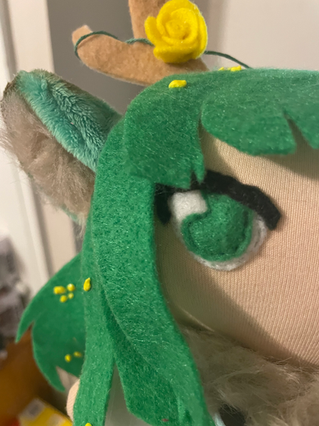 These plushies are Plush versions of the VTubers Haruka Karibu, Arai Shinomiya, and Nini Yuuna's character personas. The hair was honestly my favorite part. Figuring out the shapes that would convey each character's hair in the best way was a lot of fun. Adding all the cute details, like the roses in the antlers or drawing flowers in the skirt, was also a blast. The person who commissioned me actually sent the dolls to each of the VTubers (with credit of course) who to loved them! I used felt for the eyes since I didn't have a embroidery machine, but it was fun making each set of eyes a different shape for each character.