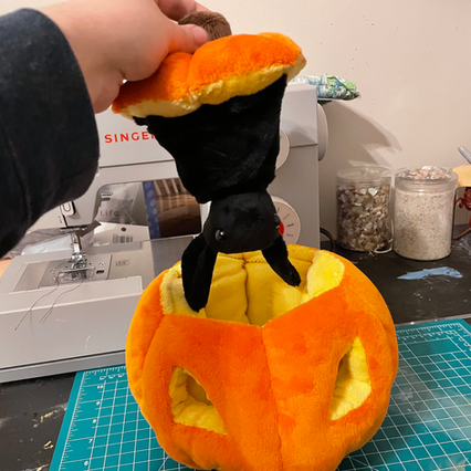 This plush is the main inspiration for my "Surprise Plush" series. I decided I really wanted to make a plush Jack-o-lantern. But instead of felt or embroidered eyes, the eyes and mouth had to actually look like cut out holes from a pumpkin. It was definitely a challenge. Eventually I figured out there was only one way to make it work, and it wasn't particularly easy, but the results are exactly what I envisioned. I was actually going to put a black cat inside the pumpkin first, but after going through some other Halloween themed ideas in my head, I thought of the bat. Having a cute upside down bat pop out of the pumpkin was just too adorable. The bat was a simple pattern nothing too difficult. I decided to make the wings poseable because the bat's wings couldn't be flapping around when pulled out of the pumpkin and sewing the wings closed would take away the fun of wings. This plush is still my top selling plush on my shop and it brought a list of new fun plushies I get to design and create!