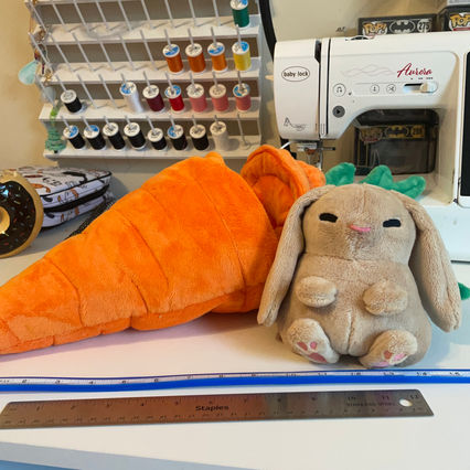 Carrot Surprise is the the Third plush I've designed for my "Surprise Plushie" series. The finally design definitely change quite a bit from the original concept, but for the better. The bunny was not too difficult to make a pattern for, it took about three tries to perfect the pattern. The carrot was a bit more complicated due to the shape and sewing ridges on a curved triangle. The images don't show this but there's actually a fabric barer in the center of the carrot. The Bunny Needed something to hold it up to give the plush it's fun peekaboo effect and the tip of the carrot needed some stuffing to hold its shape. The top of the carrot also has this but its used to make an indent in the top for the leaves. It was a lot of fun to make and gave me some interesting challenges to work out. Learned a lot from This plush!